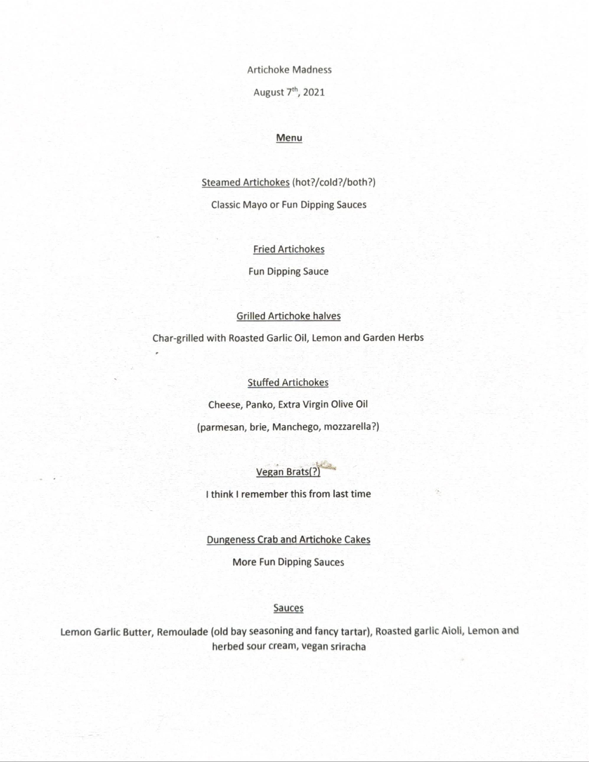 We brought back fancy Human Foosball and continued the usual supsects - Slippery Slide, trampoline, basketball. Alex the Chef starts to kick things in overdrive (see proposed menu below) and adds these Grilled Artichoke halves that he first soaks in garlic oil and herb marinator which turn out to be mind- blowingly good.