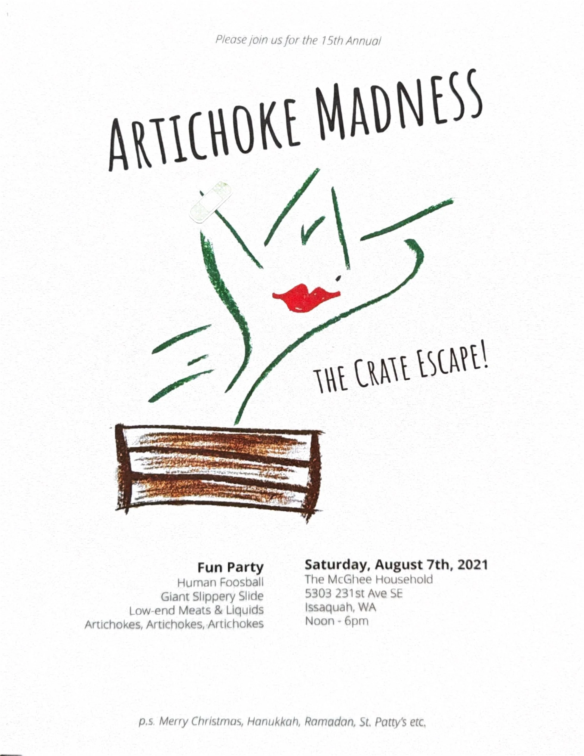 I got overconfident when I proofed the final draft and didn’t catch that I had used ‘escape the crate’ vs. ‘the crate escape’ (below). I had to reprint them because I’m not about to use a second tier theme with my Artichoke Madness Invitees!