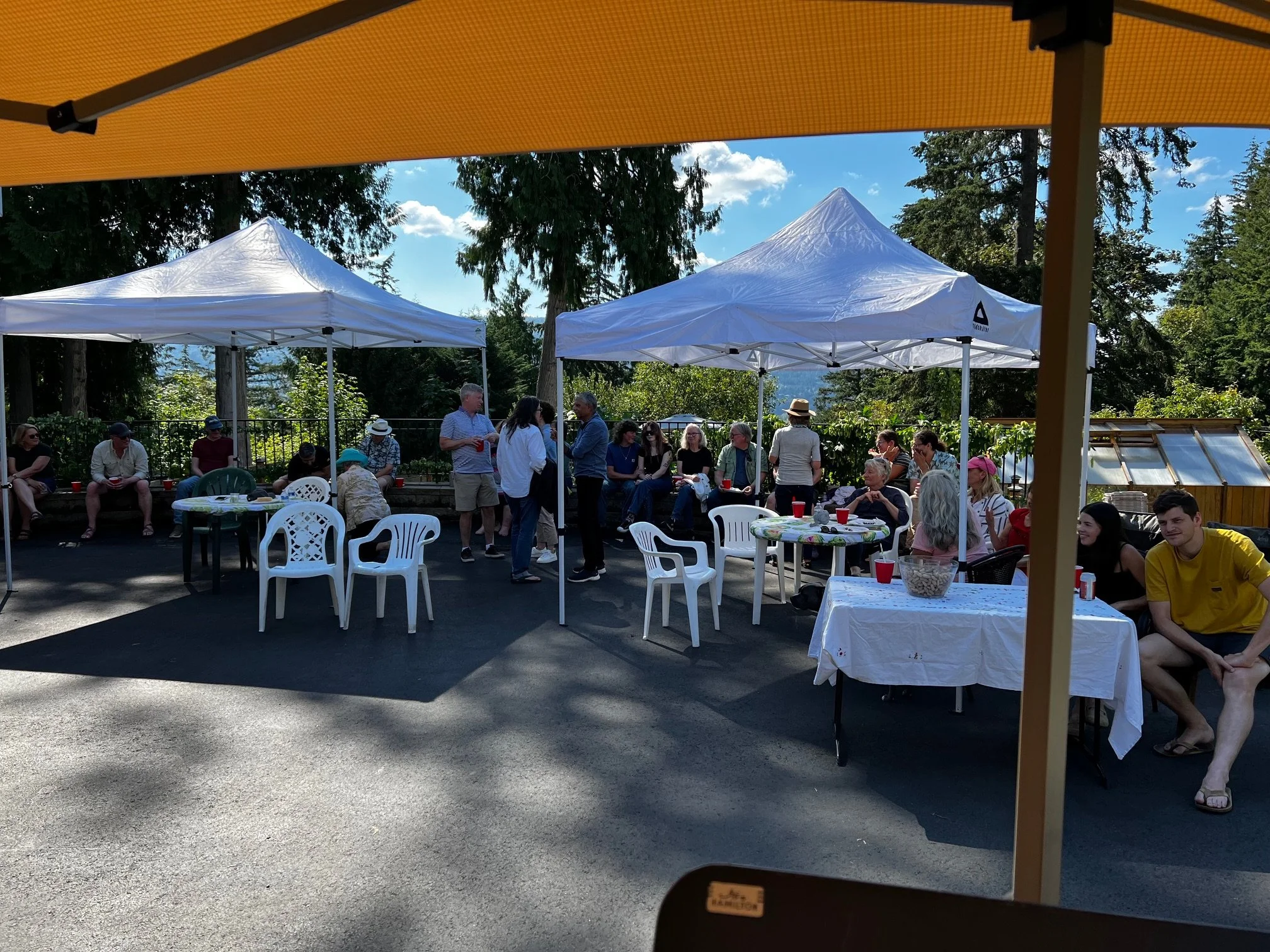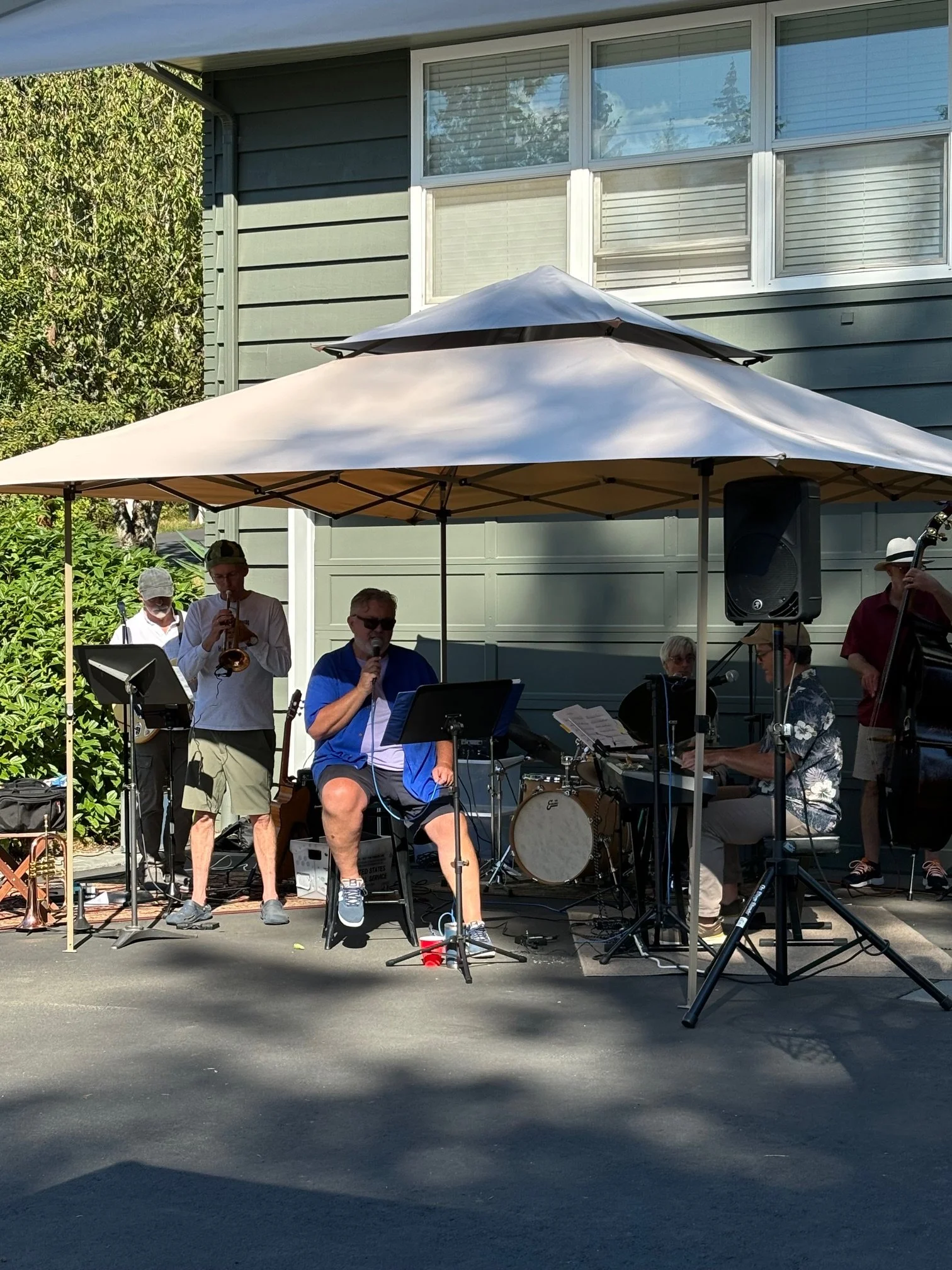 The big addition this year was live music by the Porch Pals. The Porch Pals started up during Covid and played on a porch in Kirkland every Friday for over a year. We started with 4 players - keyboards, a singer, a bongo player and me on trumpet. A professional guitar-playing neighbor heard us and showed up to play and then brought in a bass player and drummer so we are now 7-strong.