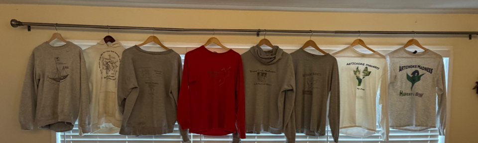 I had been getting party-themed shirts printed out before the party and would wear them with the great artichoke hat that my brother Charles made (see AM #10) so I never need to wear anything else when I’m not at work (sampling below).